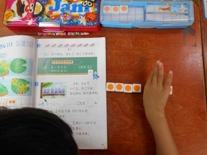 「たしざん(1)」の時とは,数図ブロックの操作の仕方が異なり,子どもたちはその違いも楽しみながら取り組んでいます。
