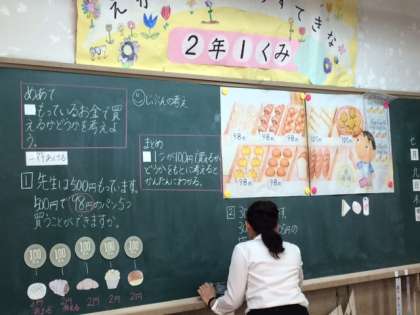 今日の算数の授業では,「100円で買えるか買えないかの判断をもとにして,複数の品物の値段を見積り,その根拠を説明する」ことをねらいとして学習を進めました。