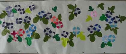 1年生が育てたアサガオの花がたくさん咲いています。たいよう学級でも折り紙でアサガオの花をたくさんつくりました。。教室横の壁面に飾りました。いろいろな色のアサガオがさいてにぎやかです。緑の葉っぱもいきいきとしています。