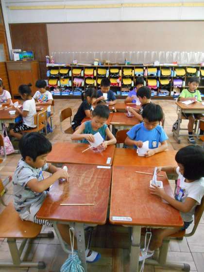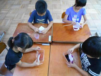 夏休みに子どもたちが集めてくれていたあさがおの花を使って,色水づくりをしました。