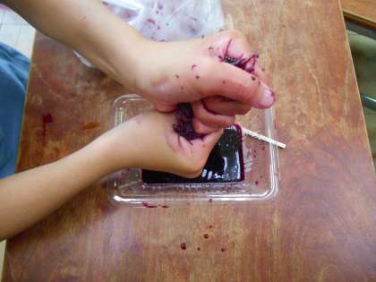 容器の中で花をもみ,少しずつ水を加えていきました。