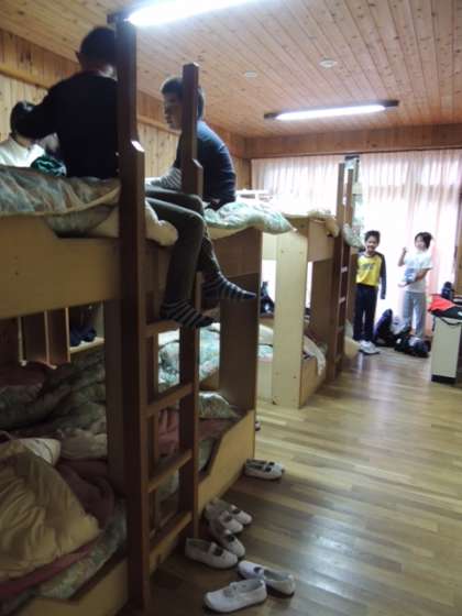 午前7時から始まる朝のつどいに向けて準備をしています。