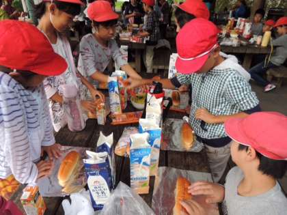 パンに食材を挟み,アルミホイルで包んだ後,牛乳パックに入れて焼けば出来上がり。