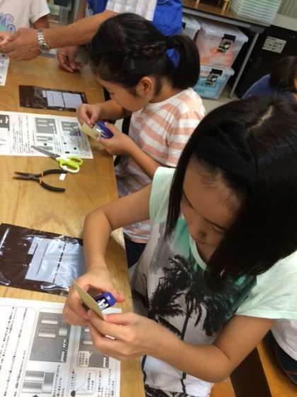 台紙にアルミホイルを貼り、部品をホッチキスで止めていきます。