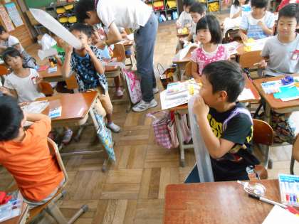 教科書の写真を見ながら,つくりたいもののイメージをふくらませました。