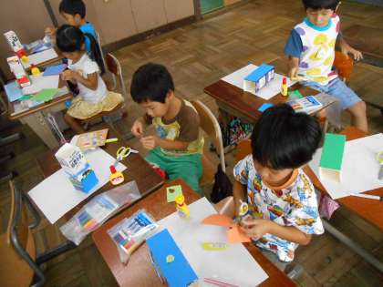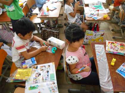 その後,牛乳パックを切って,折り紙やピグマックスなどで装飾したり,ポリ袋に絵をかいたりしました。