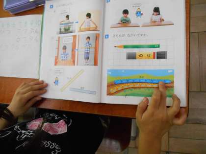 算数の単元「おおきさくらべ(1)」の学習で,いくつぶんになるか調べて比較する学習をしました。