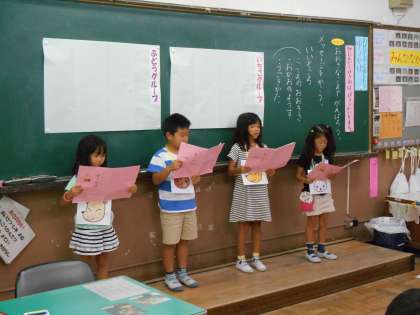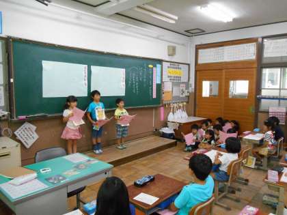 今日は国語の単元「ゆうやけ」の教材文をもとに,音読劇を発表しました。