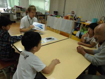 ベン先生といっしょに英語の学習をしました。まるやさんかくやしかくやハートの形と,白・赤・黒・緑・黄の色を知りました。ホワイト・・・やレッド・・・など,教室の中に置かれたカードを楽しんで探しながら,英語を覚えることができました。