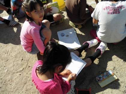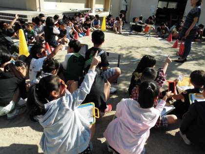 今日は理科の「太陽のうごきと地面のようすをしらべよう」の学習で,午前9時から午後2時までの間,屋外で1時間ごとに観察・記録を行いました。