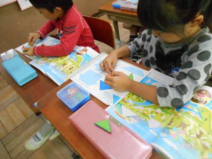 今日から算数の時間に,新しく「かたちづくり」の学習が始まりました。