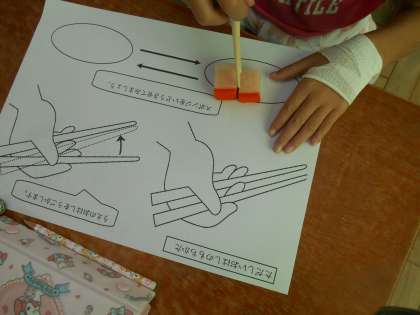 ワークシートを見ながら,スポンジを使っておはしの使い方を練習しました。