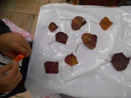 先日の秋の遠足で集めてきた,どんぐりや落ち葉などを使って,洋服づくりをしました。