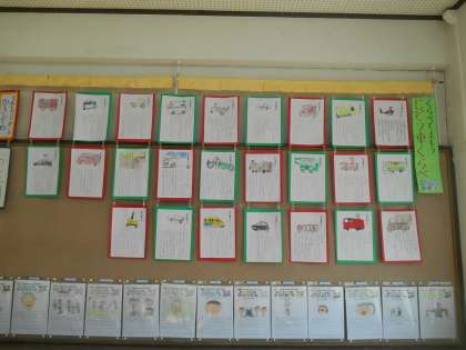 国語の教材「じどう車くらべ」の学習のまとめとして取り組んだ,じどう車カードを教室に掲示しました。