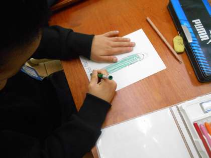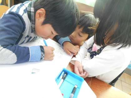 今日は,お店屋さんごっこの準備として,商品となる絵カードをかいたり,品物を売る時の言葉や買う時の言葉を考えたりしました。