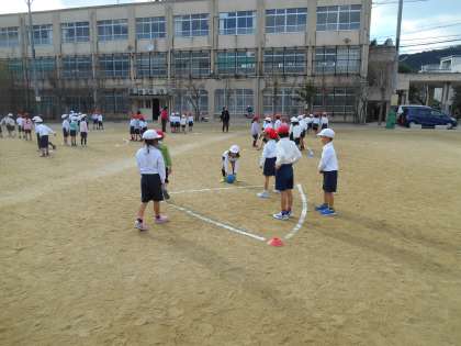ゆっくりとしたペースで,ジョギングをした後,みんなで初めてのころがしドッジボールをしました。