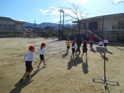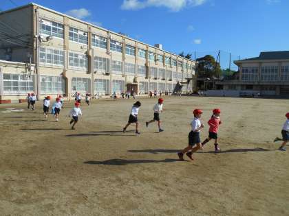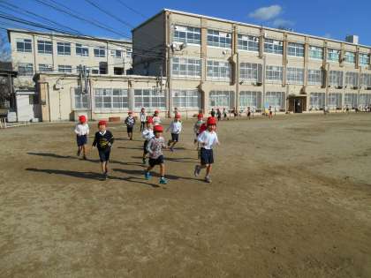 体育の時間,冷たい風の中を,1年生は一生懸命運動場を走っています。