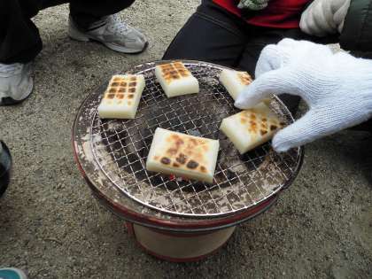 屋外の寒い中ではありましたが,きなこやお醤油をつけて食べた感想は「おいしい〜!」「もう一個食べたい!」と絶賛でした。
