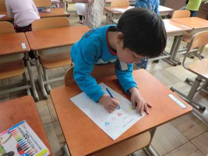 クラスのみんなにお名前を聞いて,お友だちになると,持っている紙の模様に色をぬってもらえます。