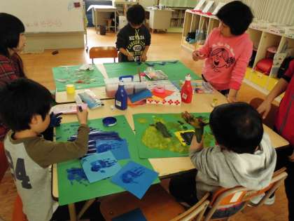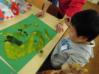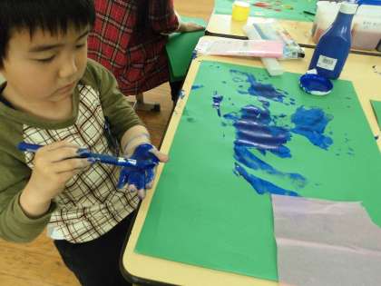 筆で塗ったり,絵の具を手のひらにつけて押してみたりと楽しんで活動できました。