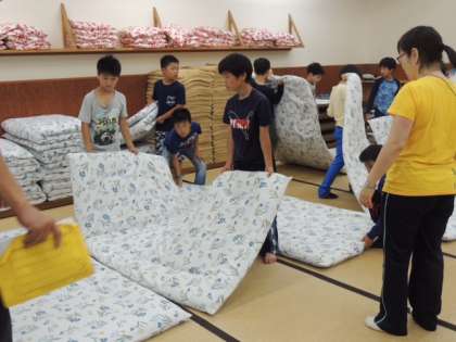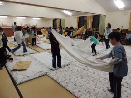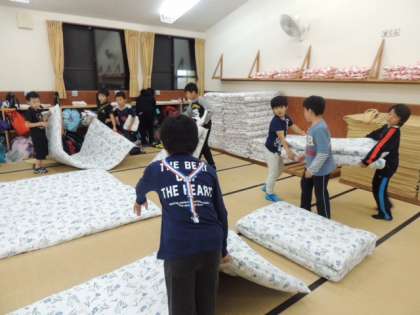男子の部屋は,反省会に使っていたため今から寝具の用意です。
