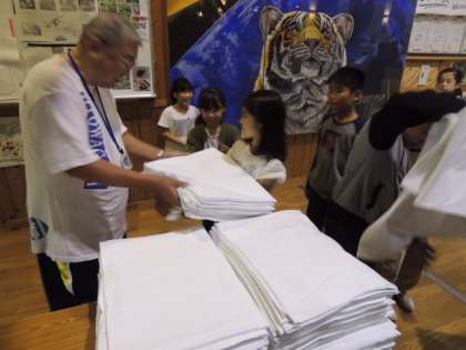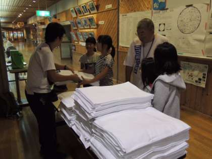 入浴を待っているクラスは、今夜から使うシーツをもらいます。