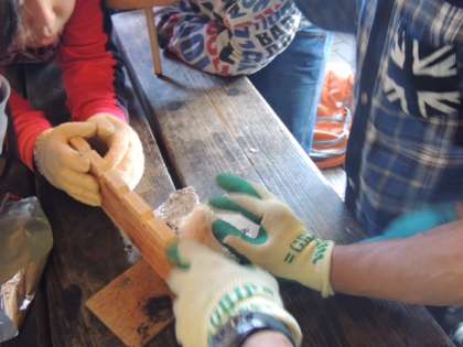 もぐさが赤くなったら、先ほどほぐした麻糸を上にのせて息を吹きかけます。