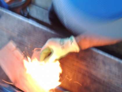 火種が出来たら、もぐさの上に落として、息を吹きかけます。