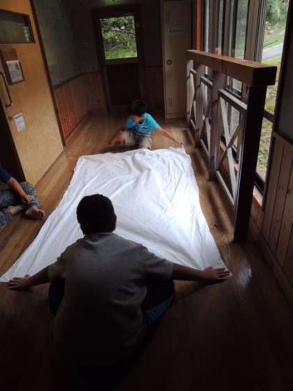 2人で協力して、きれいにたたみましょう。