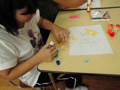 昨年度のものを参考にしながら,折り紙をちぎって文字に貼りつけながら飾り付けをしました。