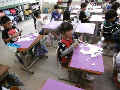 今日の二年生の図工の学習では,切った画用紙を並べて絵にする「はさみのアート」に取り組みました。