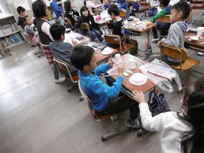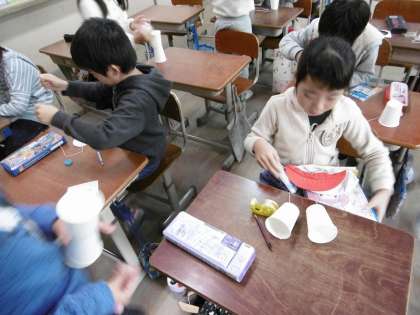 今日の2年生の図工の学習では,国語の「しかけカードの作り方」,「おもちゃの作り方」の学習と関連して,それぞれがおもちゃを作りました。