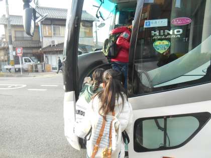 花背山の家のときと同じ場所にバスが来てくれます。わくわくした様子で,順番にバスに乗り込みました。