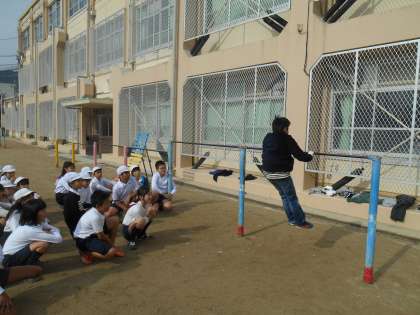 鉄棒が得意なお友だちに見本を見せてもらい,新しい技にも挑戦してみました。