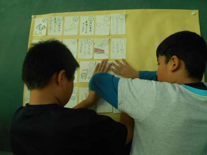 学習のまとめとして取り組んだカルタを模造紙にはりました。
