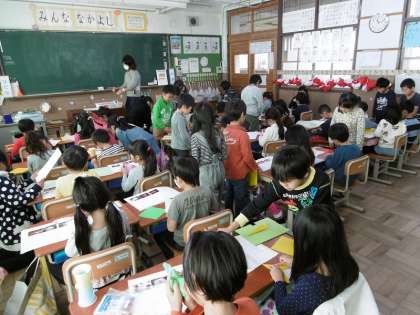今日の2年生の生活の学習では,いよいよおもちゃの作り方説明書を1年生にプレゼントしに行きました!