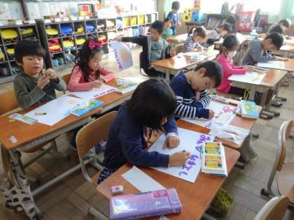 1年生は,学年目標である「みんななかよし」というメッセージを伝えるためのポスターを作成しています。