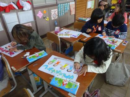 はじめはバランスよく字を書くところに苦戦しましたが,絵を描きはじめると皆集中して手を動かしていました。