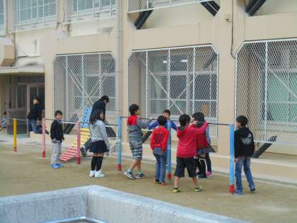 体育の時間に学習した鉄棒に,休み時間にもお友だちと集まって遊ぶ様子が見られました。