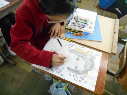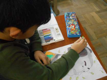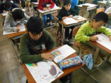 彫り終えた子はクーピーや色鉛筆で着色し,刷った時のイメージをふくらませています。