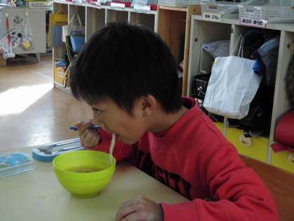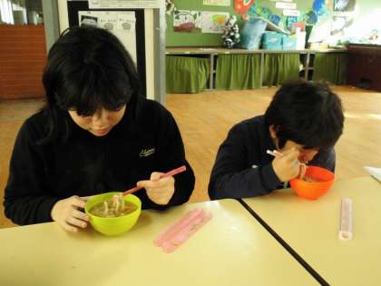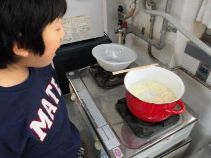 お待ちかねのうどんがようやく茹で上がり,みんなでおいしく頂きました。
