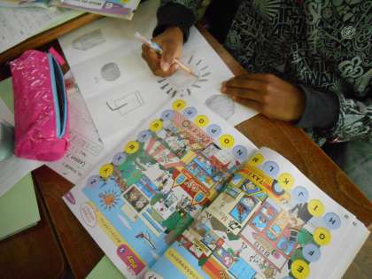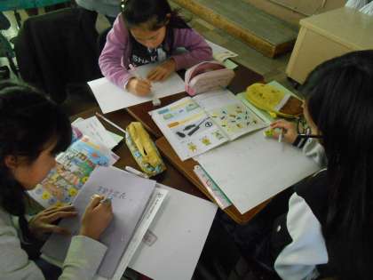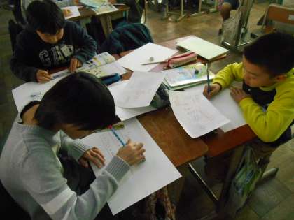 既習の単語を,Hi, friends!のページをめくりながら確認したり,班のお友だちと相談をしたりしながら進めました。