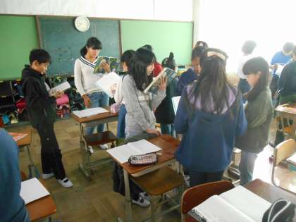 「わらぐつの中の神様」は少し長めの文ですが,熱心にグループ読みをしています。