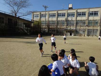 どうしてもスタートダッシュがしたくなる子どもたちですが,長く走るために一定のリズムで,呼吸を整えながら走る練習をしました。