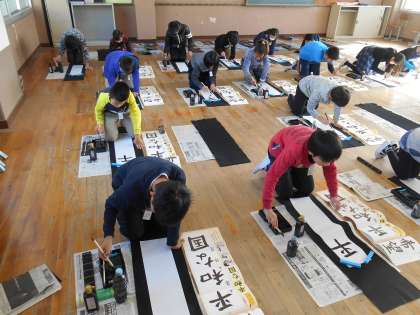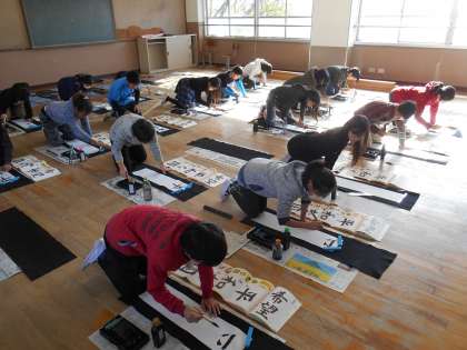 今日は少人数教室にクラスごとに時間を決めて,書き初めに挑戦しました。