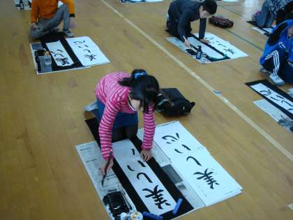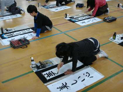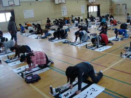 本日3,4時間目,学年全体で書き初めをしました。教室とは違って体育館だったので寒かったですが,寒さも寄せ付けないくらい集中して書いていました。