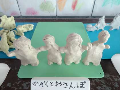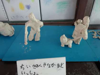地域の人と一緒にお散歩をしている子どもの作品もあり,日頃から地域の方々に温かく見守って頂き,子どもたちにとって鏡山の地域の方々はとても身近な存在なのだなと改めて感じました。