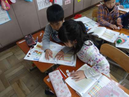 教科書の後ろの方についていた動物の絵を切り取って,その絵を100までの数の表の上に置き,絵の下に隠された数を当てるゲームをしました。
