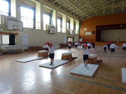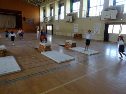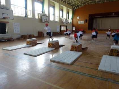始めは少しこわがる様子もありましたが,慣れてくるとピッとポーズをとったり,より遠くにとんだりと,のびのび取り組んでいました。
