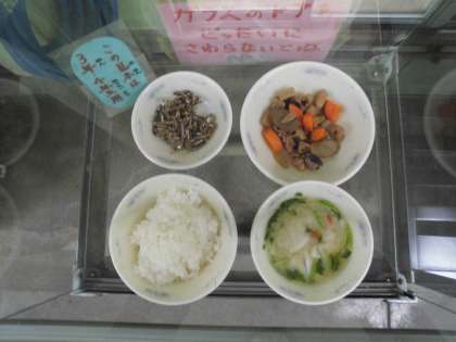 今日は1月の和献立でした。お正月料理である,にしめ・ごまめ・白みそを使ったみそしるがでました。和献立についての動画やパワーポイントを使いながら,それぞれの料理にどんな意味が込められているのかや,各地方のぞうにについて学習しました。お正月のことも思い出しながら,今日もおいしく食べることができました。